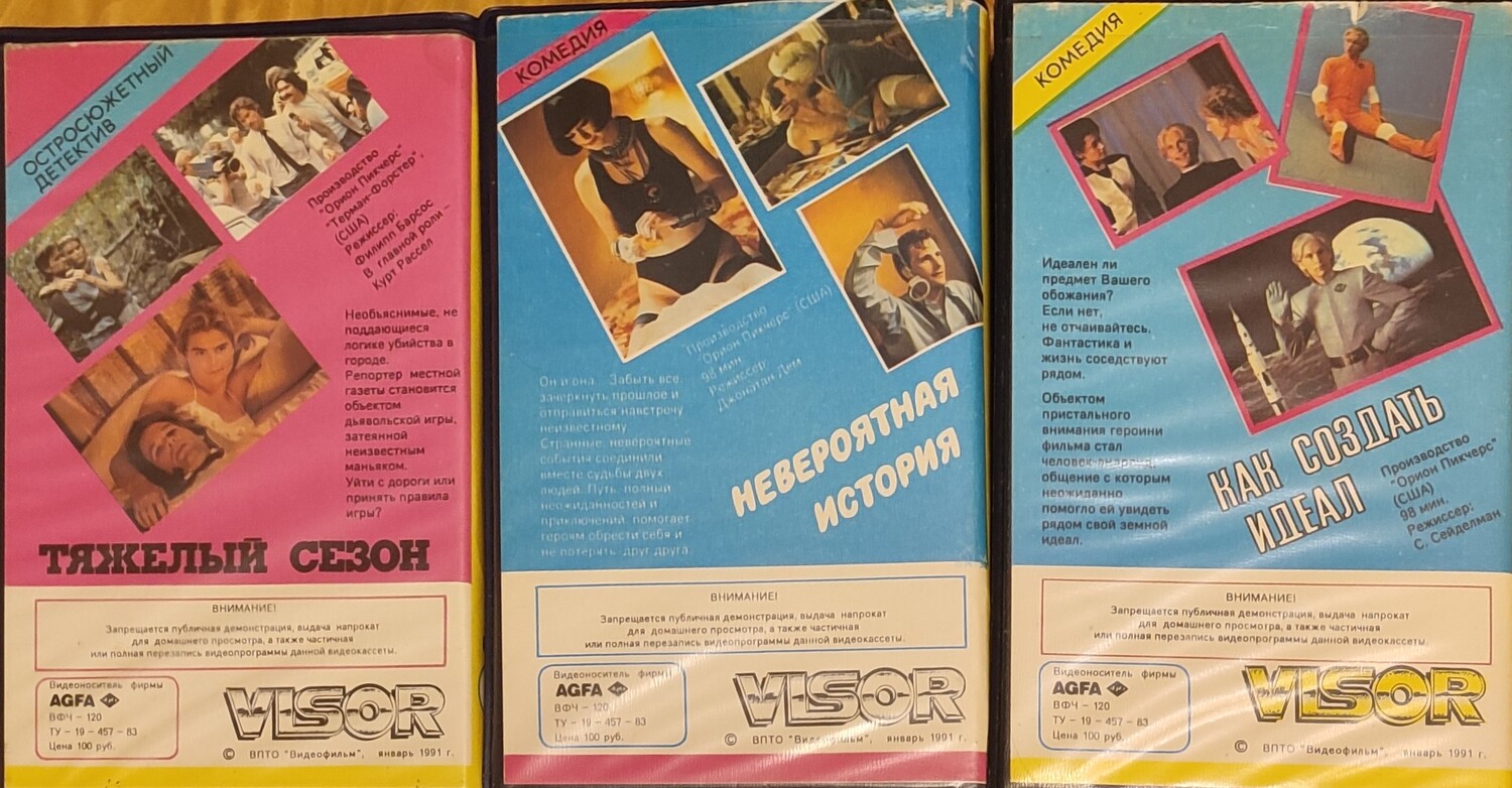 1. Госкино - выходили фильмы и концерты (Альбано и Ромина Пауэр в Ленинграде, Андриано Челентано в Москве и т.д.) с многоголосым дубляжом, фильмы шли в советских киноверсиях (менялась даже заставка иностранных фильмов), кинокопии. 2. Видеофильм, он же Visor - существовал в 1990 - 1991 годах, одноголосый (мужской и, что удивительно, женский) дубляж иностранных фильмов, встречаются очень редко.